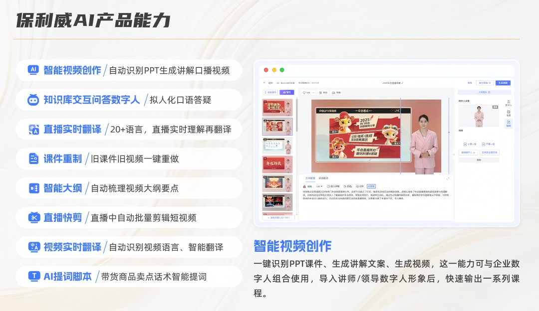 在教學起點,AI重塑內容生產力。面對優質師資稀缺與課程開發周期漫長的普遍困境,保利威AI數字人智能制課方案提供高效解法,實現從內容理解、生成到呈現的全流程智能化。講師僅需上傳PPT,AI可自動撰寫詳細的與PPT匹配的講稿,并可選擇1:1還原本人形象和聲音的AI數字人分身出鏡講解,將一門高質量標準課程的產出時間從以“周”計縮短至以“小時”計。課程還可以一鍵生成多語種版本,為個性化與國際化的教學需求提供前所未有的敏捷支持。