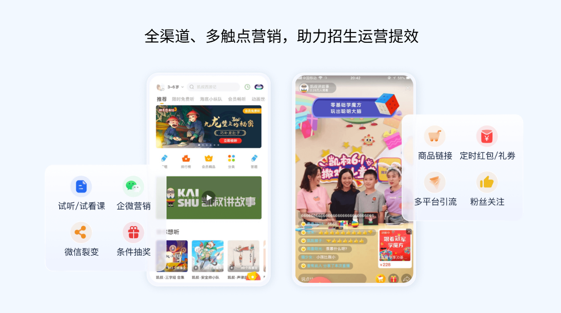 (3) 微信生態無縫適配,支持小程序、公眾號、H5多終端一鍵分享,搭配邀請有禮、分銷推廣功能,讓本地真題微課、線上體驗課快速在3-5公里社群裂變傳播,替代發傳單等低效獲客模式。