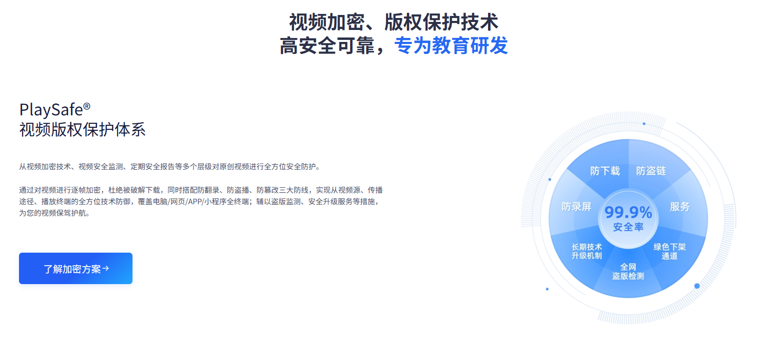 對于教育機構而言,名師課程是最珍貴的知識產權。保利威為此提供金融級安全保護,自研PlaySafe®視頻安全體系集成VRM13碎片化加密、防下載、防盜鏈。業內首創H5播放器加密、APP、網頁、微信全終端加密保護,可指定網站播放,一ID一碼觀看,避免非法傳播,支持瀏覽器防錄屏、ID跑馬燈、AI視頻水印等,從源頭有效震懾與防止課程被非法傳播,保障機構的核心商業利益。