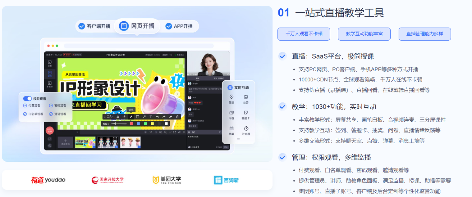 在教學端,講師能通過屏幕共享、畫筆白板、三分屏課件等多種形式清晰地展示知識點,并使用畫筆工具對重點進行圈畫講解,高度還原線下課堂的板書與互動場景。為進一步確保教學效果并激活課堂,平臺集成1030+實時互動功能:講師可隨時發起簽到、答題卡、抽賞、問卷,例如在講解一個難點后立刻發起測驗,實時查看正確率,并針對錯誤率高的題目進行即時講解,實現“講-練-評”閉環。此外,助教可通過聊天室、點贊、彈幕、消息上墻及直播情緒反饋,與學員進行多維、及時的交流。