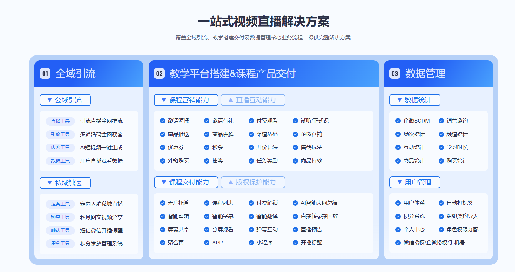 保利威為企業提供Webview集成、原生SDK集成、插件化+SDK集成及ODM定制等直播技術方案。機構可通過保利威提供的直播SDK&API,將直播間播放器嵌入自有小程序或App中,實現低成本二次開發、快速上線。同時,保利威開放了豐富API回調,可自定義數據回收,覆蓋觀看人次、時長等多類指標。直播間功能齊全,由保利威維護更新,集成配置簡單,能夠和學員管理、CRM、企微等業務系統打通,精準回收用戶數據,為運營策略提供數據支撐。