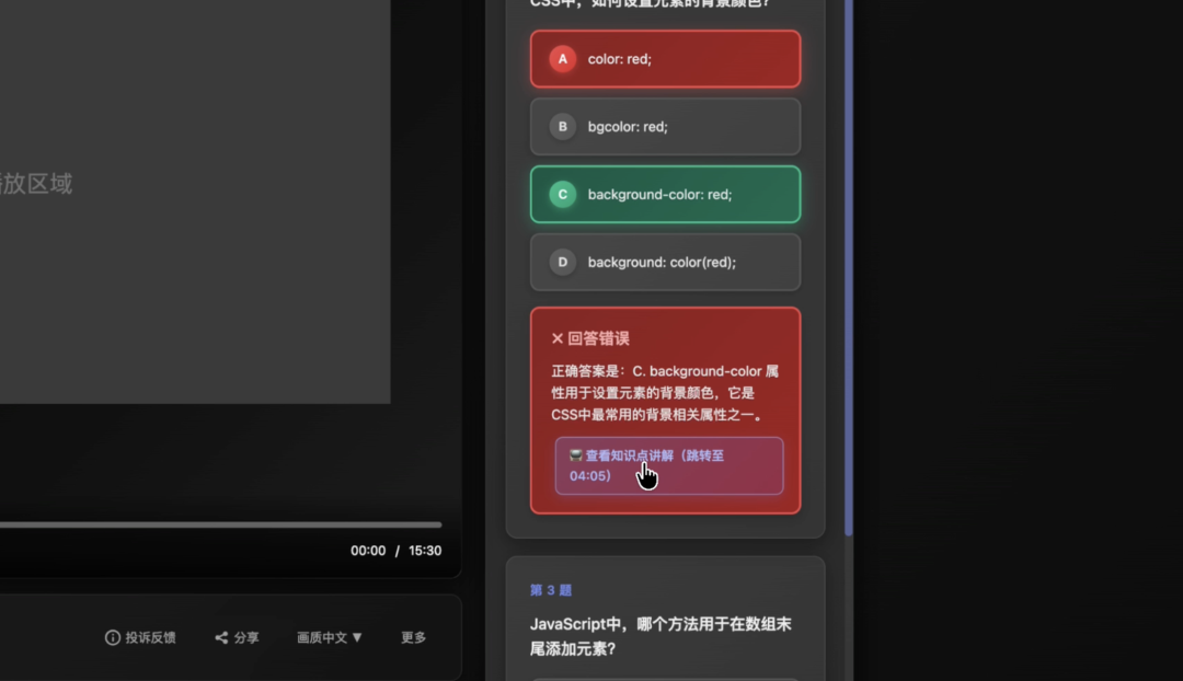 學生觀看課程、考試后,可以點擊題目快速挑戰知識點對應的視頻片段進行學習,學后即考、錯題立即重學,提高學習成效。