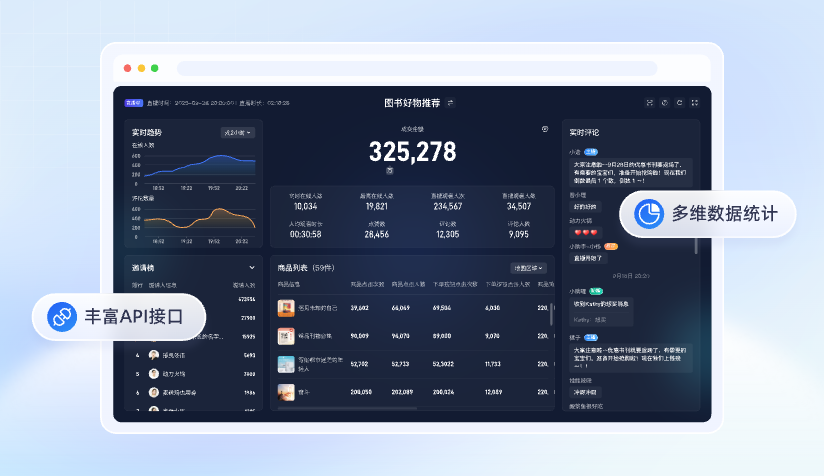 保利威首先為企業提供直播系統的原始數據,涵蓋觀看行為、互動行為、商品數據、營銷行為等方面,便于企業對觀眾、商品、運營、助播等角色和模塊做出決策,解決“無數據可依”的難題。更進一步,實現直播前中后數據全沉淀,維度更多、更細,助力企業分析決策更科學、更有依據,例如直播訪問觀看、商品點擊、下單轉化、復購推薦、新老標簽…… 在此基礎上,進一步釋放數據深化價值。基于保利威私域直播系統SDK或400+API,企業可以極簡集成、自定義數據埋點或與企業CRM、會員系統、ERP等核心業務系統進行打通,進一步完善客戶畫像,助力銷售轉化,實現“數據善用”的進階。