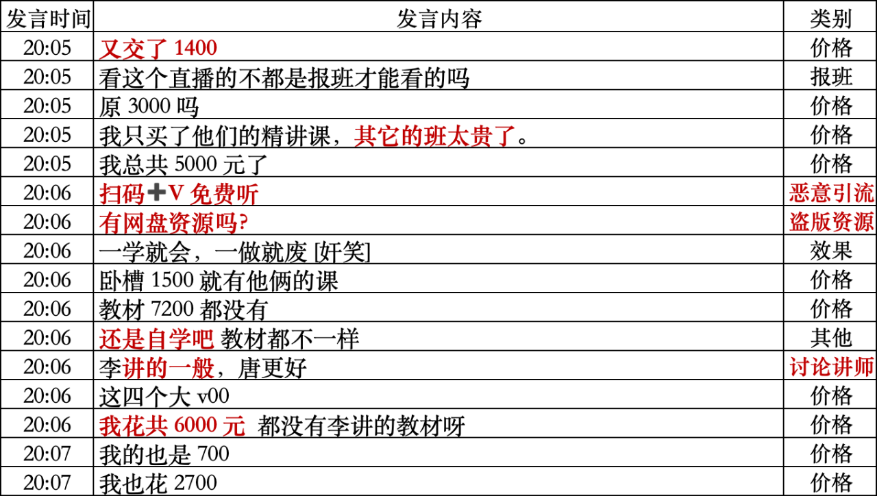 知識付費機構的運營和銷售最怵引流直播課,直播就意味著銷售邀約的機會客戶在場,友商的一些銷售也會混進直播間搗亂,發送一些引流的微信號、二維碼、價格不劃算等等不雅評論。該機構的課程營銷負責人表示:“直播課的效果很好,但聊天室的管理壓力很大,看起來是個機械工作,但一不留神就會引發負面輿情。”