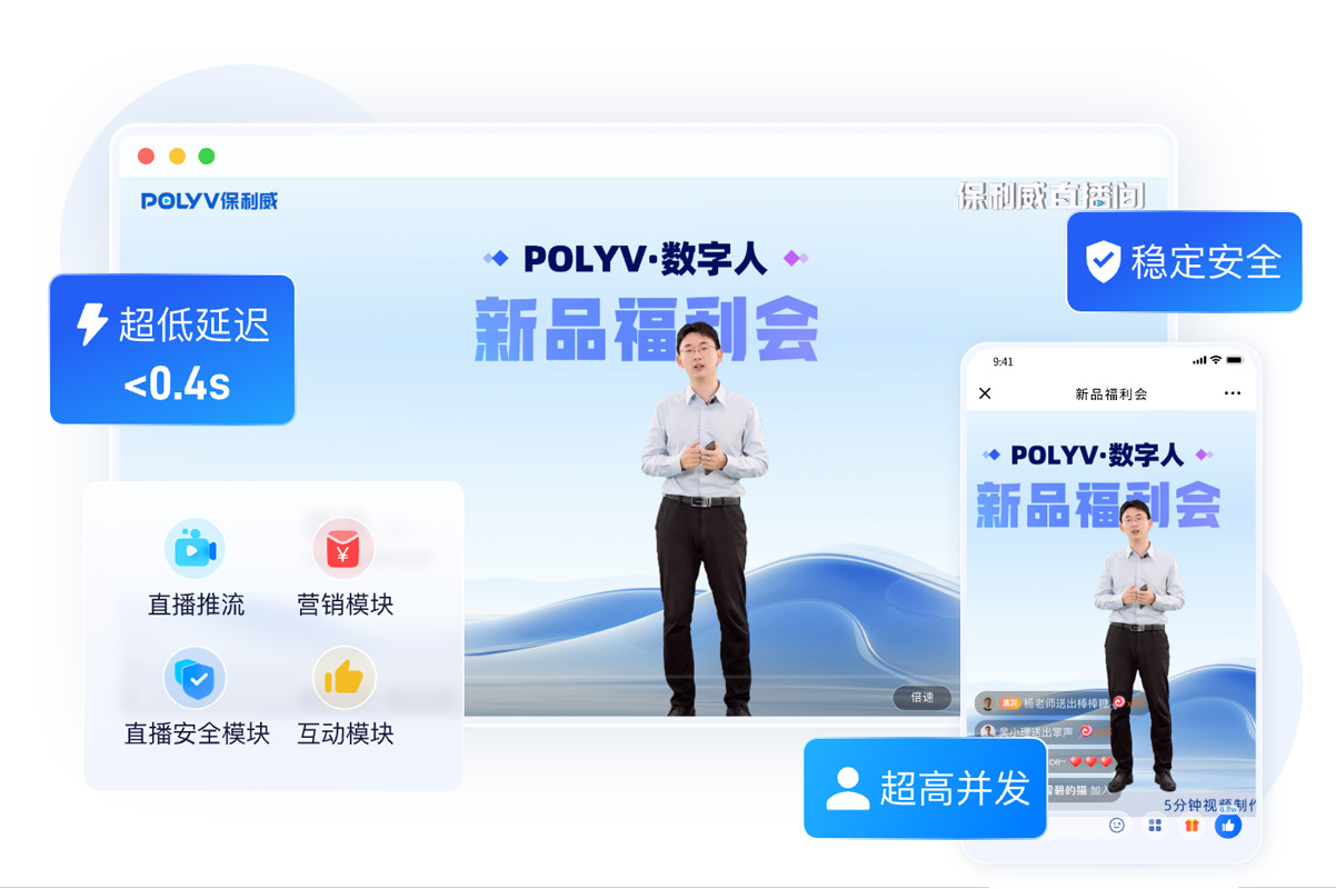 在性能層面,保利威直播平臺支持千萬級并發,延遲低于400毫秒,即便在70%丟包的弱網環境下仍能保持穩定通信;平臺已全面適配Android、iOS、HarmonyOS等系統,并提供4K超清、畫中畫等能力,確保從大規模電商營銷到連鎖門店定向直播、在線互動教學等多樣場景都能順暢運行。