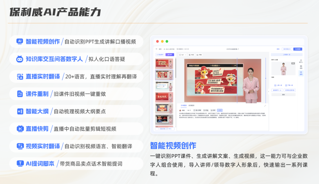 今年大會上,AI成為貫穿論壇與展區的核心話題。保利威同樣在這一領域進行了積極探索。基于DeepSeek等先進技術,保利威推出了數字人視頻創作平臺,僅需三步即可將PPT內容轉換成口播視頻,幫助企業以低成本快速生成宣傳與教學視頻;智能字幕與實時翻譯功能,則為跨境會議與國際營銷消除了語言壁壘。除此之外,保利威還建立了多層級風控機制和AI聊天審核,覆蓋內容審核、違規識別與合規斷流,幫助企業守好直播與視頻傳播的底線。